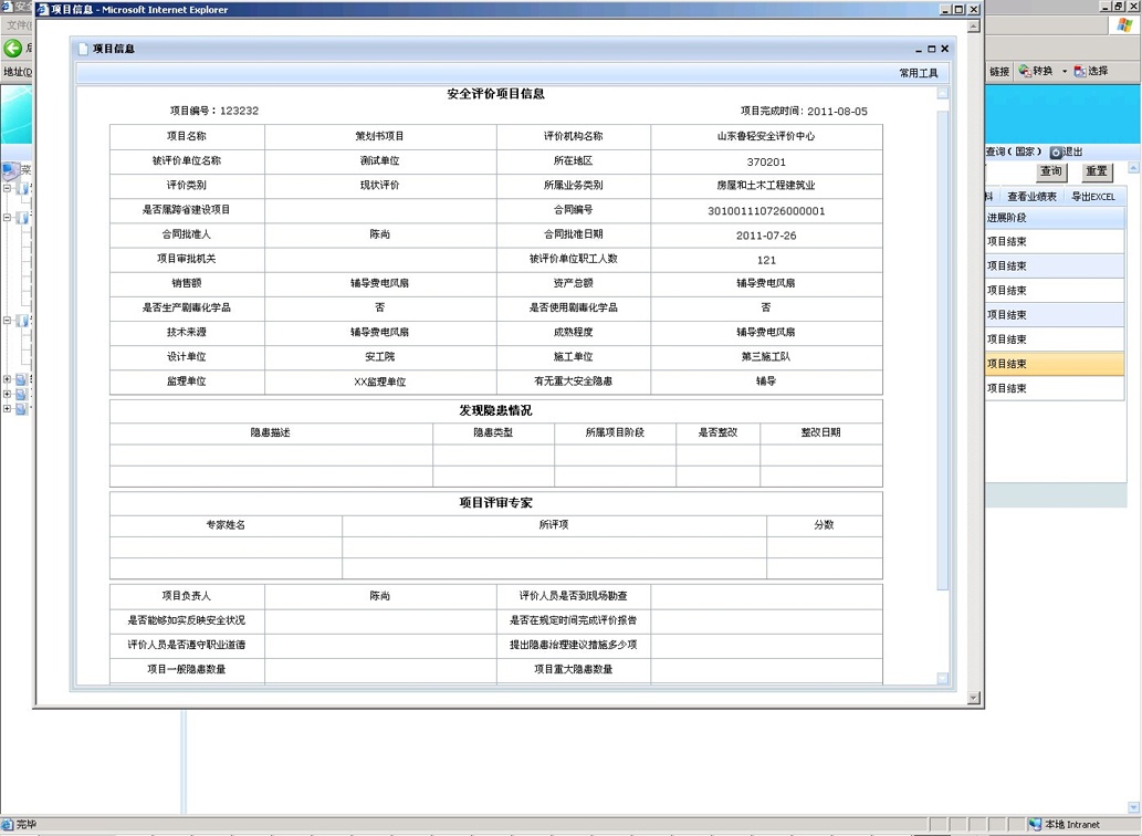 按照安評(píng)過(guò)程控制標(biāo)準(zhǔn),結(jié)合安全評(píng)價(jià)機(jī)構(gòu)的日常工作流程,對(duì)安全評(píng)價(jià)整個(gè)過(guò)程進(jìn)行網(wǎng)絡(luò)化地控制和監(jiān)管,根據(jù)風(fēng)險(xiǎn)分析、實(shí)施評(píng)價(jià)、報(bào)告審核、技術(shù)支撐、作業(yè)文件、內(nèi)部管理、檔案管理和檢查改進(jìn)八要素對(duì)所有評(píng)價(jià)項(xiàng)目過(guò)程進(jìn)行嚴(yán)格把關(guān),要求安全評(píng)價(jià)機(jī)構(gòu)將現(xiàn)有項(xiàng)目的進(jìn)度情況及時(shí)上報(bào)到系統(tǒng)中,規(guī)范安全評(píng)價(jià)機(jī)構(gòu)工作流程,實(shí)現(xiàn)安全評(píng)價(jià)過(guò)程控制的信息化,在方便安全評(píng)價(jià)機(jī)構(gòu)內(nèi)部管理的同時(shí)有利于監(jiān)管部門(mén)對(duì)安全評(píng)價(jià)機(jī)構(gòu)的評(píng)價(jià)行為進(jìn)行實(shí)時(shí)動(dòng)態(tài)的監(jiān)督管理。