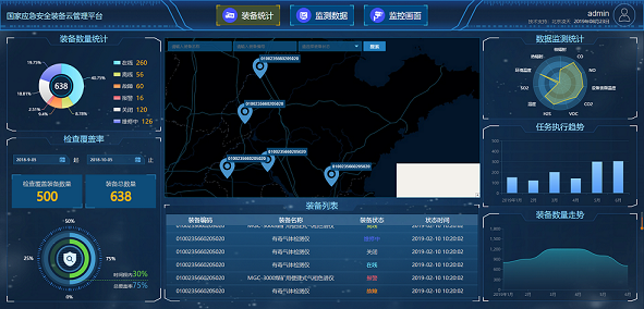 國家應急安全裝備云管理平臺集設備分布、裝備統計、視頻集成于一體,做到全局把控、設備監測、全生命周期綜合使用可視化操作。當遇到突發事件時,能在線直觀的分析并高效的了解到設備實時狀態。 國家應急安全裝備云管理平臺通過與服務器后臺平臺進行信息傳輸,實現線上查看設備信息的操作、瀏覽和統計。工作人員可以通過國家應急安全裝備云管理平臺了解各個設備的基本信息,掌握現場設備設備的工作狀態、運行情況、監測氣體、視頻、電量情況等信息,從而快速實現了裝備與人、裝備與云、人與云互通互信的過程,同時解決了以前對設備信息不了解、現場情況無法實時查看、效率低、難題。在提高工作效率的同時增加了物聯網的準確性和先進性,解決了以往信息傳遞難、無電子版信息儲存、無統計分析等問題。 | |