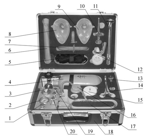 It is an emergency apparatus for automatically implementing breathing positive-negative pressure, and can continuously feed fresh air with oxygen into the lung of wounded person. Filled with oxygen for medical use, it could remove foreign matter in mouth and air duct and implement breathing when there is oxygen existed. With small in size, light in weight, easy to operate, reliable performance, convenient to carry features, it is specially used in the spot for disaster event, coal mine rescue, and also applied into emergency rescue and first aid for medical institute while out work as well as escorting the wounded person.