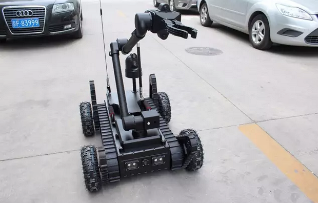 機械臂部分配備爆炸物銷毀器、瞄準器,能現(xiàn)場對爆炸物進行摧毀;