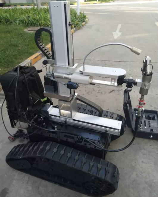 破拆機(jī)器人,也可用于遠(yuǎn)程遙控偵察人難以達(dá)到的地形的一種機(jī)器人。機(jī)器人配備十字滑臺,靈活調(diào)動工具的工作位置,可加載手持式切割機(jī),還可以加載獨立電動液壓工具其包括:微型開門器、微型擴(kuò)張器、微型剪切器之間可以靈活更換,底盤采用履帶結(jié)構(gòu),能適應(yīng)各種地形快速作戰(zhàn)部署。