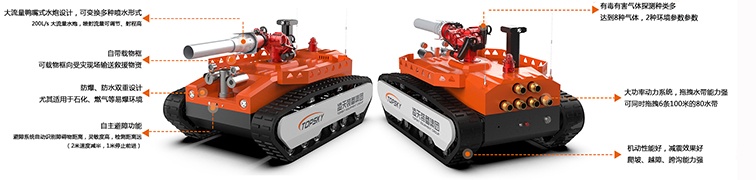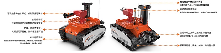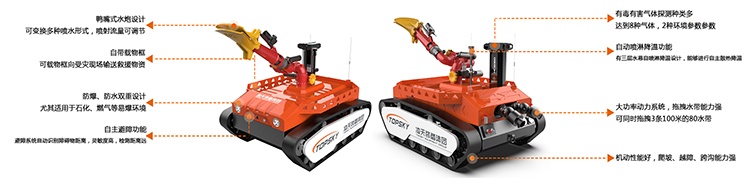 本產品具備滅火、音視頻偵察、有毒有害氣體偵察、災區環境偵察功能;