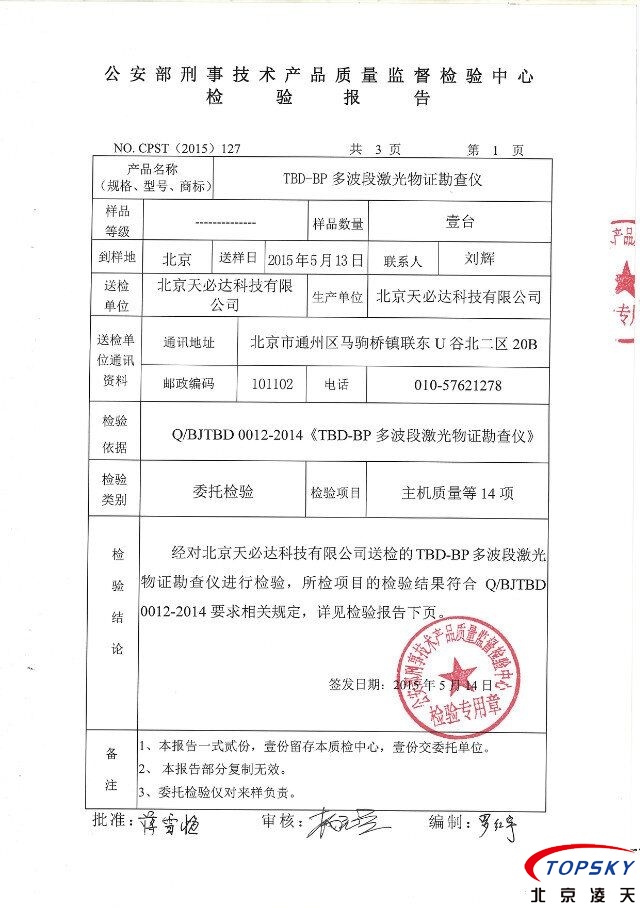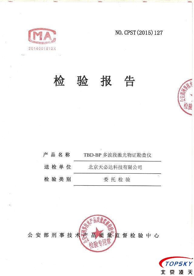 北京天必達自主研發多波段激光物證勘察儀取得公安部檢測報告