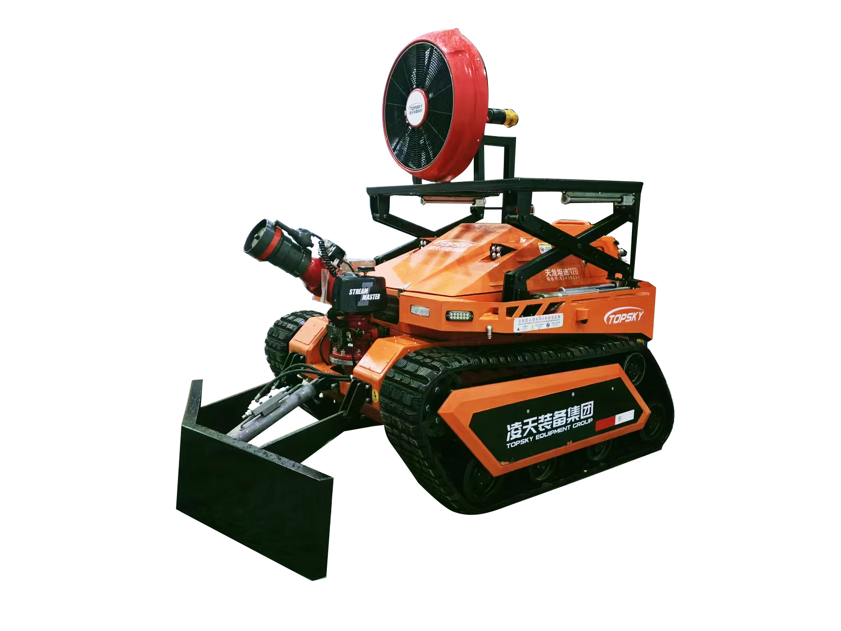 消防排煙滅火機(jī)器人是一款履帶式中型油動力消防滅火機(jī)器人,采用柴油發(fā)動機(jī)為動力,閉式液壓系統(tǒng)驅(qū)動ASV橡膠履帶進(jìn)行高速行走,搭載了每秒120升的大流量消防炮,具有60000m3/h的可升降大流量水力排煙機(jī),及V型推鏟,攜帶多種檢測、監(jiān)控傳感檢測裝置,對火災(zāi)場所實(shí)施遠(yuǎn)程實(shí)時(shí)監(jiān)控,進(jìn)行火災(zāi)撲滅、煙霧及有毒有害氣體驅(qū)散,道路開辟清障。
