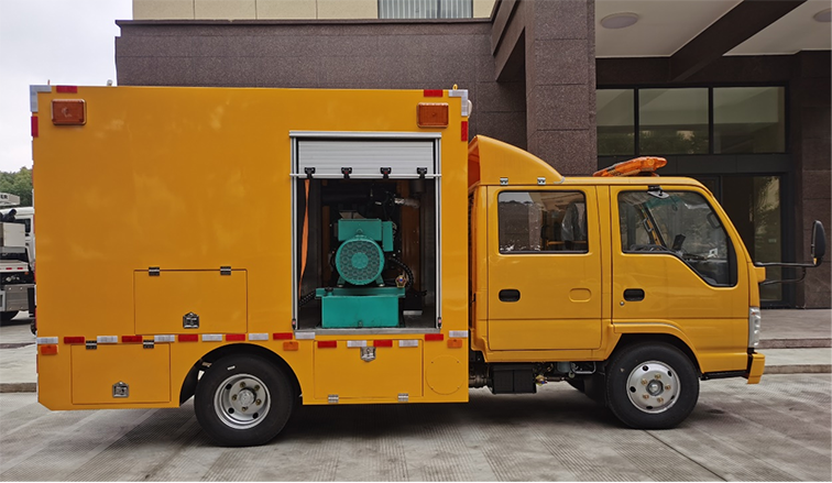 雙排座排澇車(1200m3),是在慶鈴二類汽車底盤的基礎上依據排水車的特點,配置柴油發電機組、兩臺大流量便攜式潛水泵并整合照明設備等功能設計改裝成型的專項作業車,整車尺寸較小,通過性較強,廣泛適用于各類搶險現場。