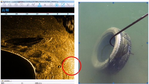 其中,藍(lán)色箭頭指向藍(lán)色線條為自動(dòng)檢測(cè)的水底線,三艘沉船,分別對(duì)應(yīng)實(shí)物如下,小船約為3米長,大船約為5米長。