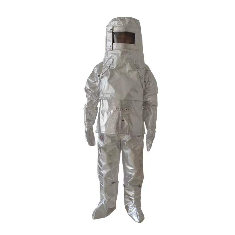 該服裝由鋁箔耐高溫隔熱布、阻燃隔熱:層及舒適層組成,具有耐磨、隔熱、抗輻射熱等性能?;济媪喜缓蕖⒉AЮw維,具有重量輕、耐高溫、耐折以及對人體無毒害等優點,能有效地保障消防隊員和高溫作業人員不被烈焰、高溫灼傷。是消防隊員在火場及高溫事故現場進行搶險作業的理想防護服裝。