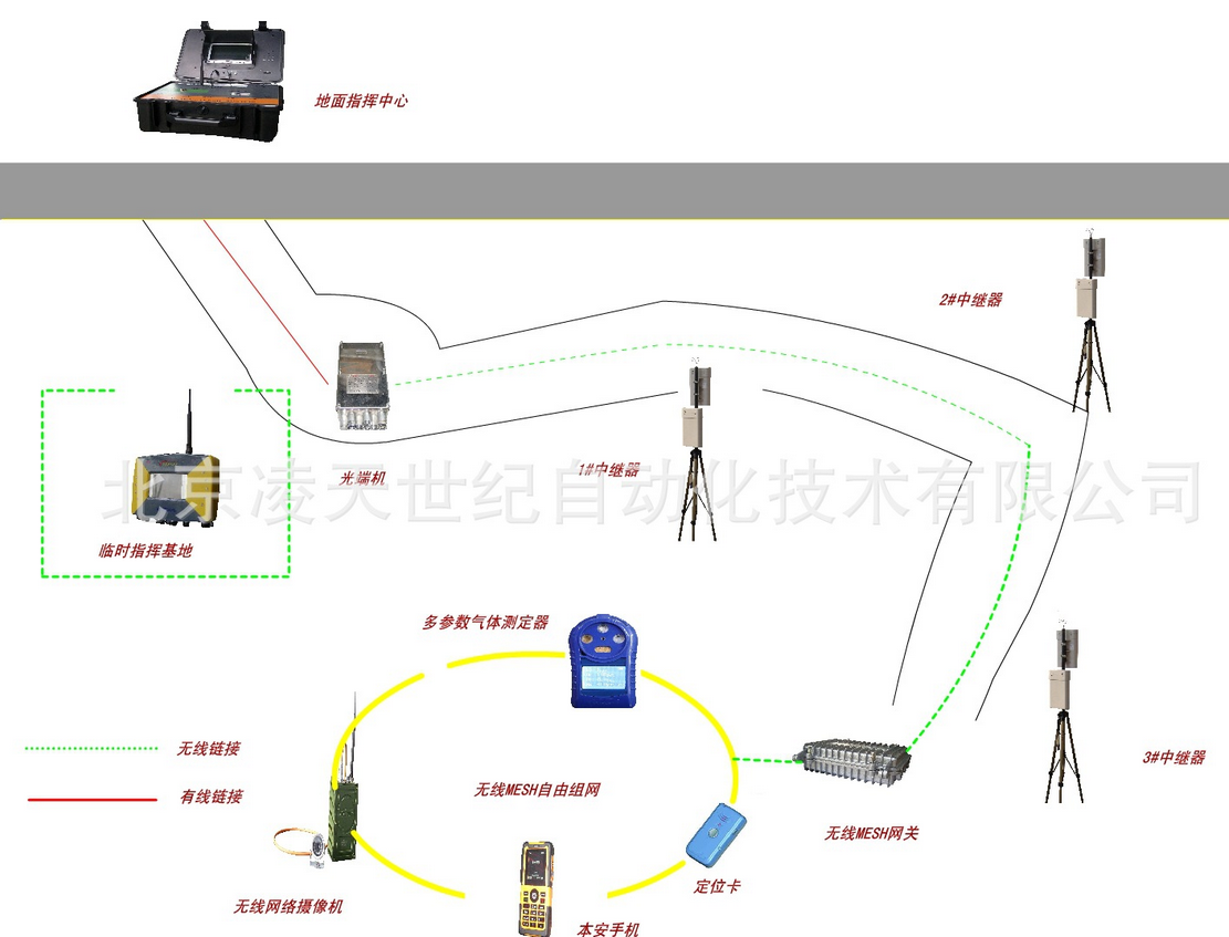 它不需要依賴管道等介質,不同與泄露通信,特別適合于搶險救災,與國內外同類產品相比。該裝置輕巧便攜,能在隧道、地下建筑和復雜建筑群的地方無線傳送語音和災區環境信息。無線發射器及攝像頭,由救護隊員隨身攜帶,它可以實時地將現場的音視頻信息傳輸到基站,基站再將信號傳到地面指揮中心。井下災區的救護隊員、井下救援基地和地面指揮中心之間可進行實時信息溝通,救援全過程的圖像、語音資料可完整儲存并回放,為今后進行事故原因分析、總結搶險救災經驗教訓提供基礎資料。若同時連接互聯網,救援指揮中心及指導專家可實時了解災區救援情況。
