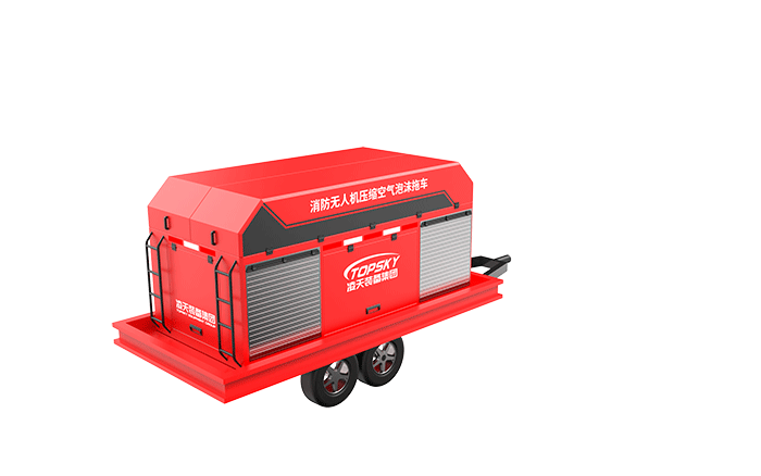 消防無人機壓縮空氣泡沫拖車,采用中置軸掛車為運載平臺,搭載我司自主研發(fā)的水帶系留式重型消防滅火無人機和壓縮空氣泡沫系統(tǒng)(CAFS),自帶水和泡沫滅火劑,具備高效滅火(高效泡沫隔離、冷卻、窒息)、高空破窗,自動避障、展開快速、精準鎖定火源、多角度控制火點、空中作戰(zhàn)時間長等特點。機身采用純碳纖維和航空鋁材料制作而成,減輕機身自重同時提高物質載重量,該無人機具備陸空兩棲功能,可以在地面行駛,行走系統(tǒng)可快拆;可噴射水及壓縮空氣泡沫,使用超輕型浮力水帶噴射的壓縮空氣泡沫密度更輕,可以能快速啟動升空,拖帶水帶升至高空,系統(tǒng)操作穩(wěn)定性更強。