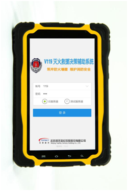 V119 滅火救援決策輔助系統,通過指揮終端與消防指揮中心進行信息實時上傳、指揮指令下達、車輛部署、數據監測等消防指揮工作。